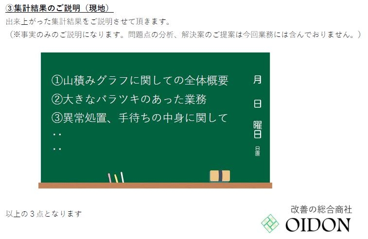 | 詳細 | 「ビデオで撮影された作業者の1日の動きを集計します(代行業務)」