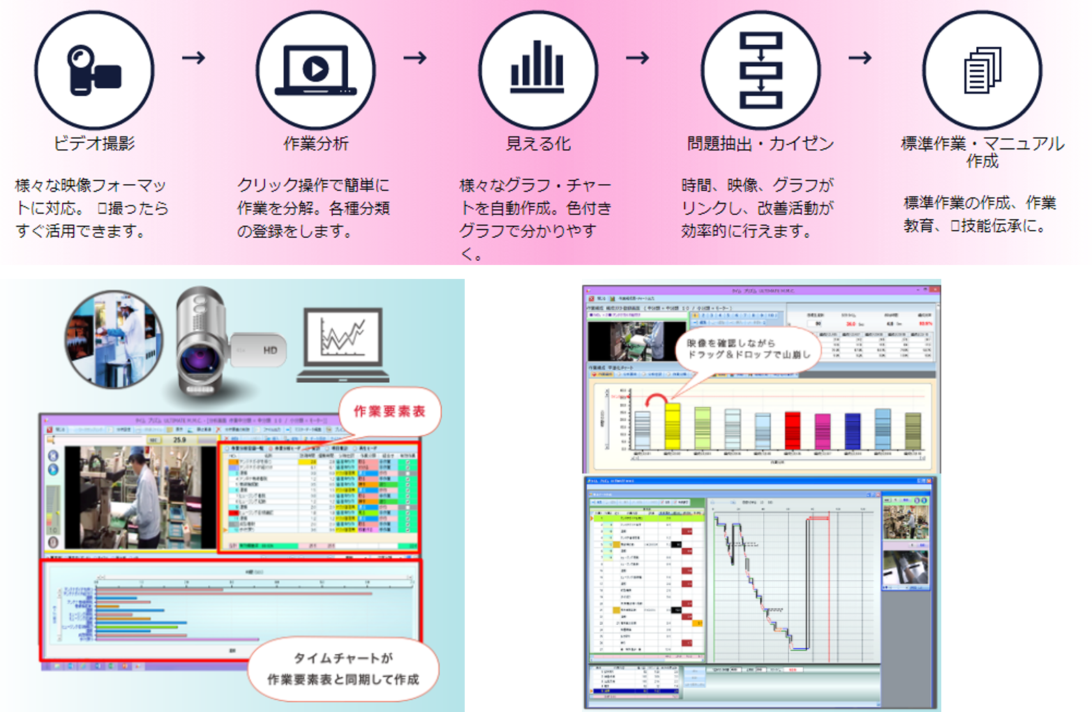 作業分析・作業改善ツールソフト「タイムプリズム」は作業をビデオで撮影し、パソコン上で映像を再生しながら作業分析を行う改善支援ソフトです。日頃の製造業務を行う中、ビデオを撮り、だれでも改善活動に入ることができるように、そして効率的に現場のボトルネックを見つけ、その改善策を見出すことができることを目的に開発したソフトウェアです。 |