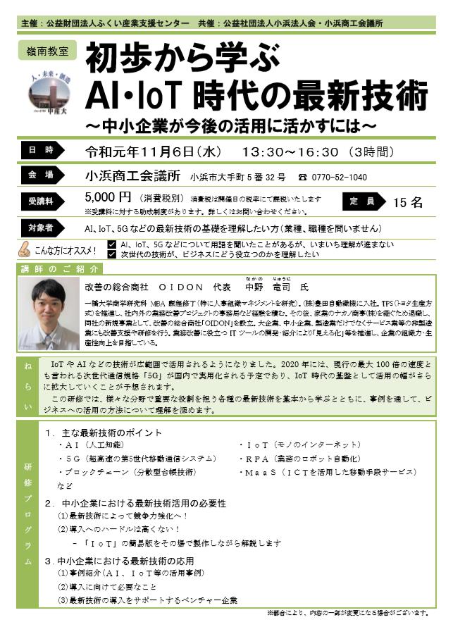 11/6(水) 『初歩から学ぶ AI・IoT時代の最新技術』 というタイトルで、