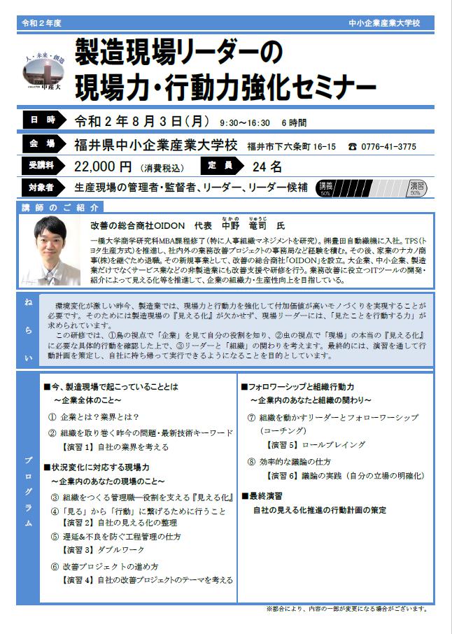 8/3(月) 『製造現場リーダーの現場力・行動力強化セミナー』 というタイトルで、