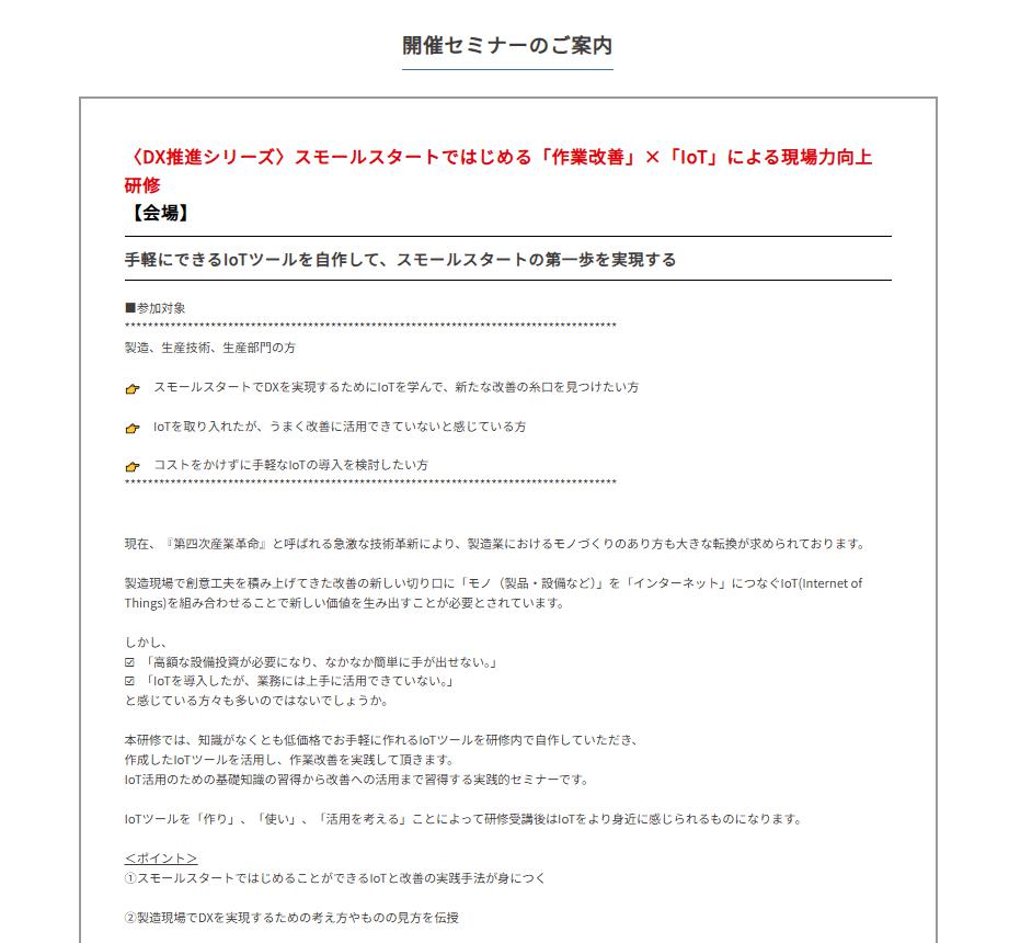 9/3(水) スモールスタートではじめる「作業改善」×「IoT」による現場力向上研修というタイトルで、