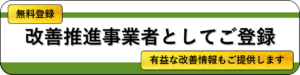 改善推進者様も改善ツールを使うことで、目に見える改善のアシスタントとなります。弊社既定のご紹介手数料もお支払い致します。まずは、下記ご登録窓口にて改善推進事業者としてご登録ください(無料)。改善ツールのご紹介、改善のための有益なご情報も随時お伝えしていきます。